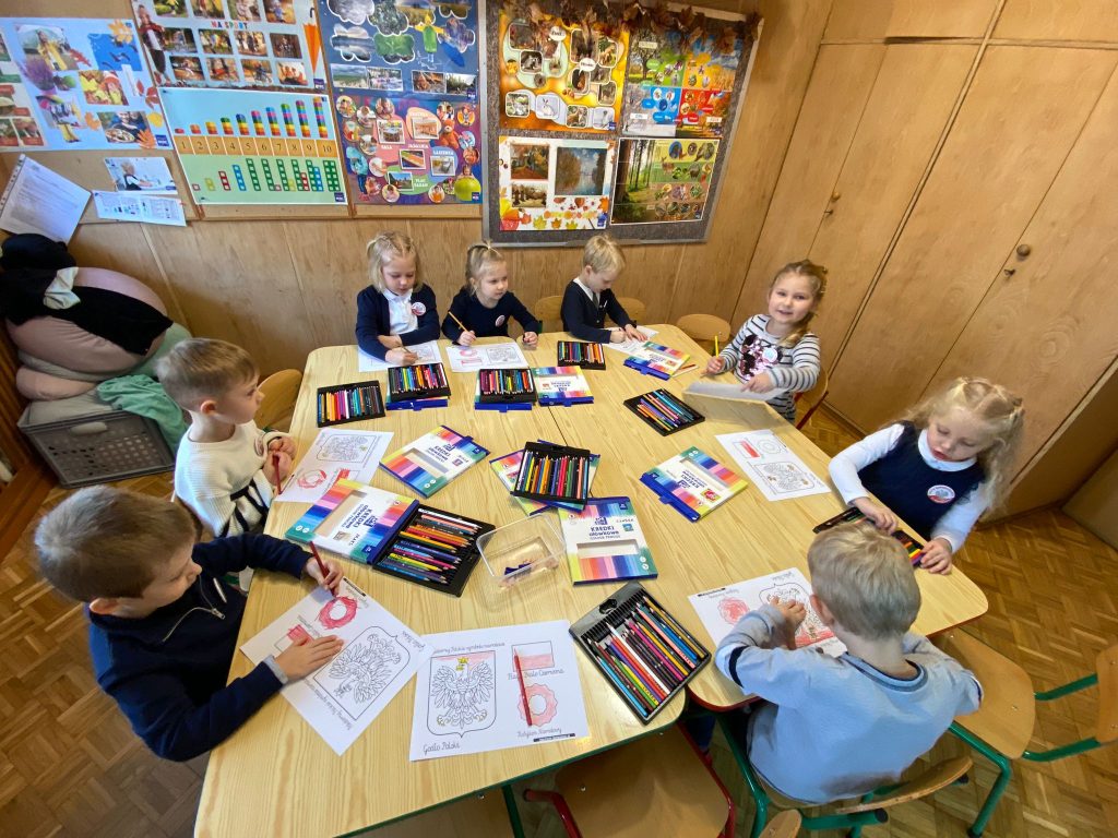 Pierwszym zadaniem było kolorowanie flagi i godła polskiego. Kolejnym etapem zajęć było stworzenie własnych kotylionów. Dzieci, korzystając z kolorowego papieru, nożyczek i kleju, tworzyły małe odznaki, które później z dumą prezentowały.