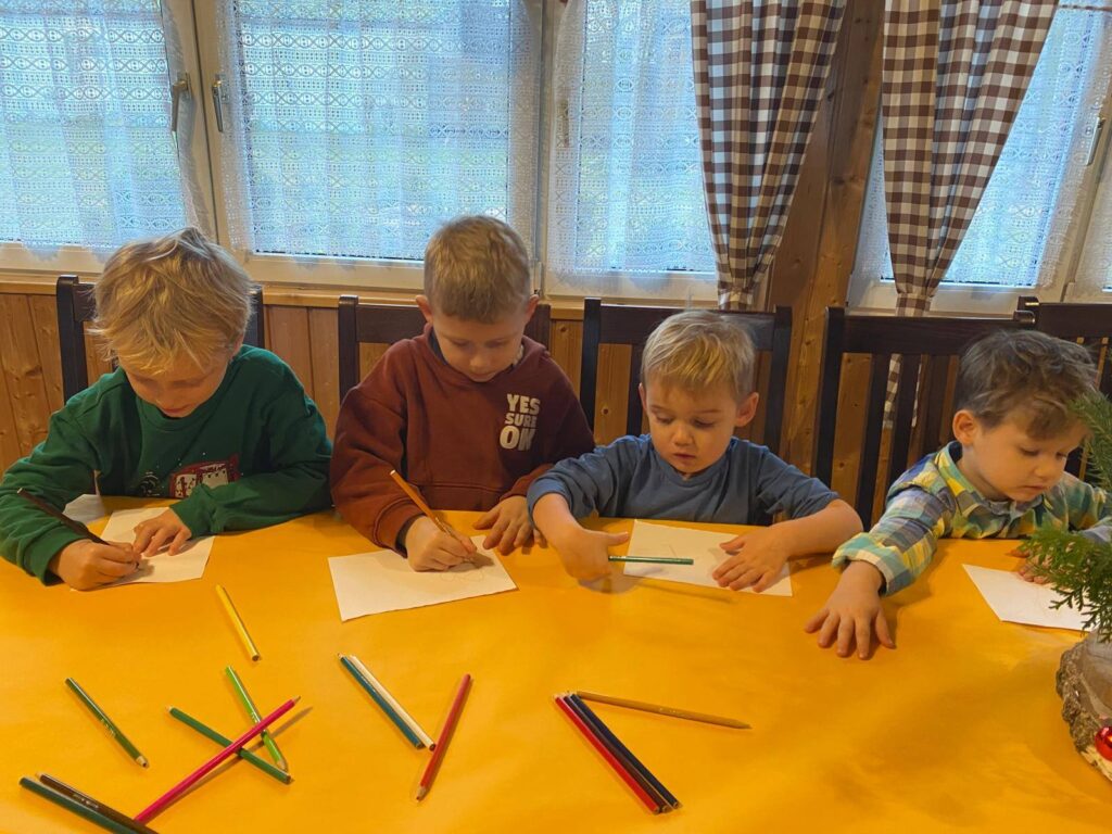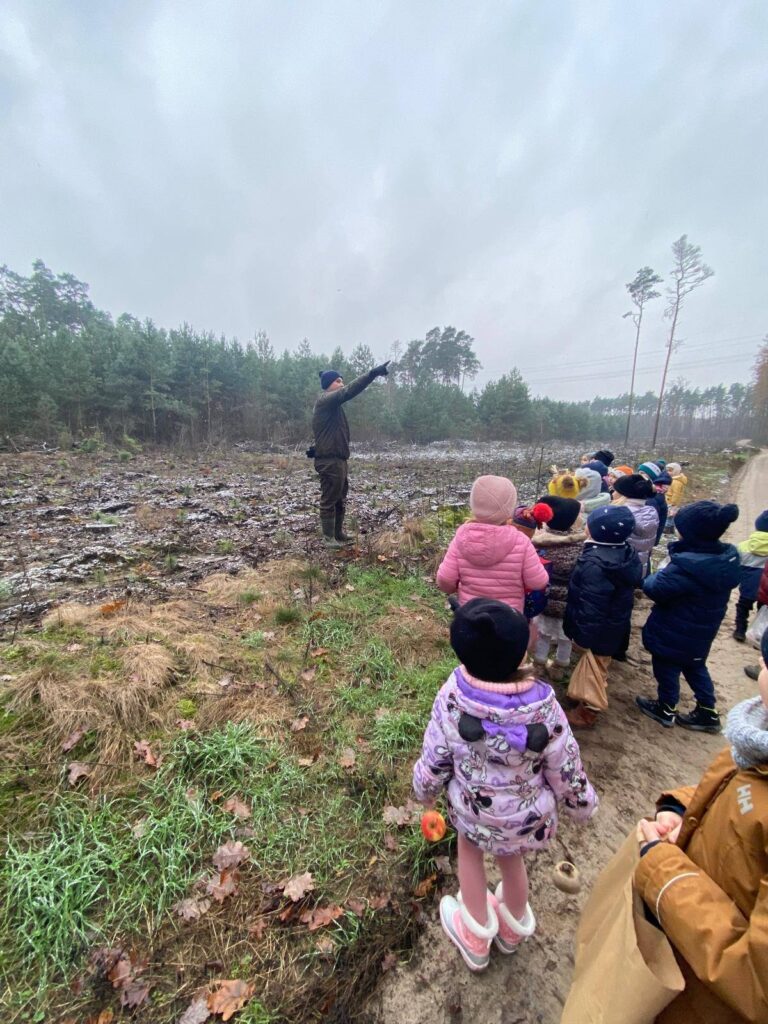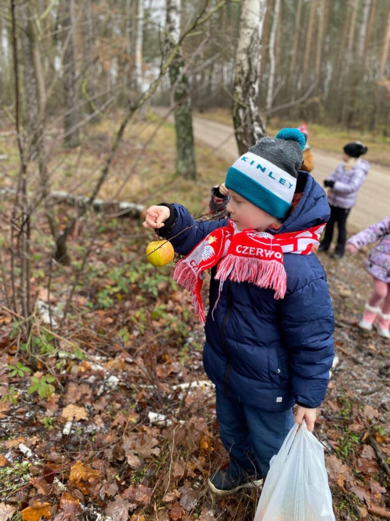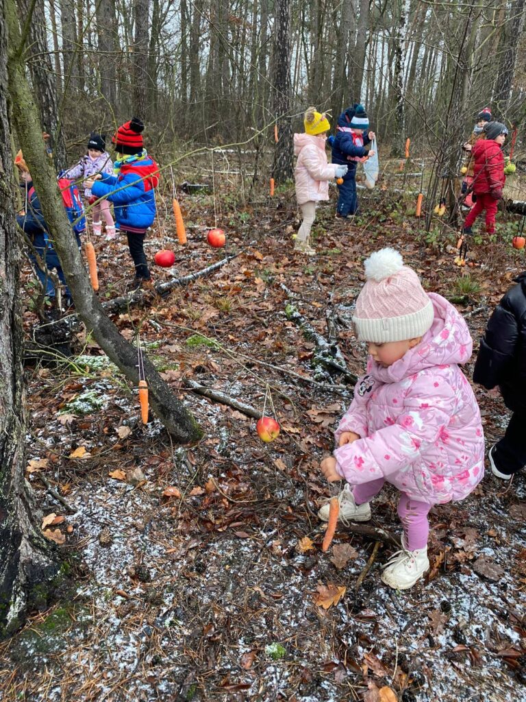 Zwieńczeniem wyjazdu stała się wyprawa do pobliskiego lasu. Dzieci miały tam okazję zadbać o leśne zwierzęta, wieszając na gałęziach jabłka i marchewki. Nasz przewodnik barwnie opowiadał o tym, jak zwierzęta radzą sobie zimą, dlaczego tak ważna jest pomoc, oraz jakie rośliny i zwierzęta można spotkać w tej porze roku. Dzięki temu maluchy nie tylko świetnie się bawiły, lecz także poznały cenne informacje na temat zimowego życia w lesie.